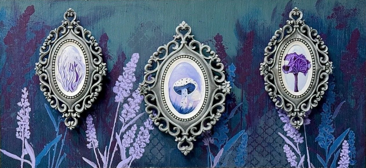 Acrylic, 2025, Sold A small study on mushroom varieties painted on wood panels, set to a background meadow painted in acrylic.