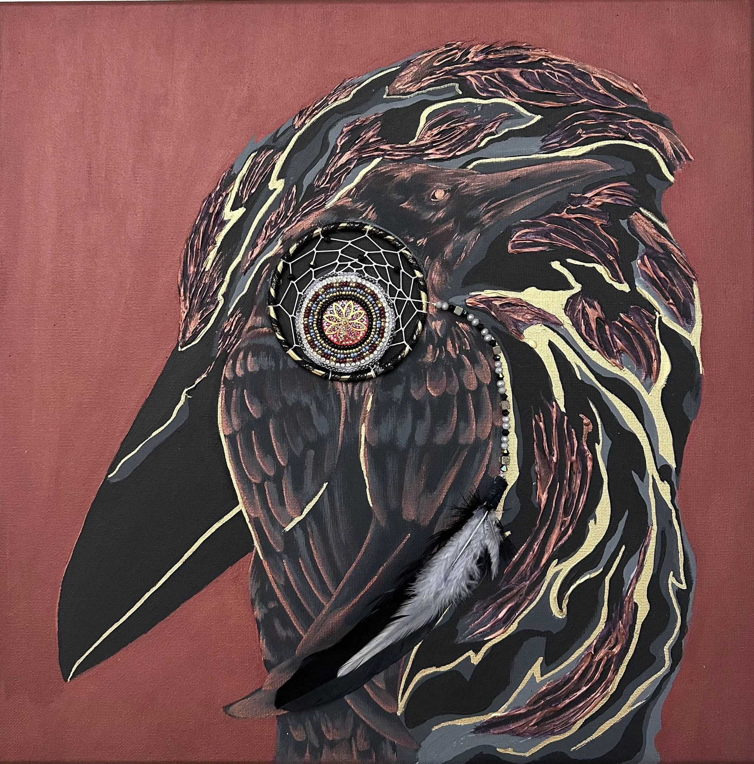 Acrylic, Mixed Media, 2025 The Weaver was a deeply personal piece that infused my relationship to the medicine of the raven spirit as a messenger.