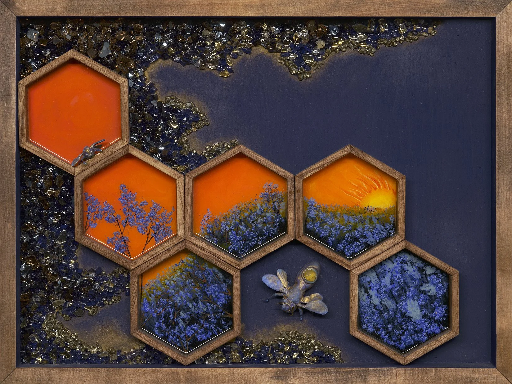 Created on a wood panel, using acrylic paint, fire glass, clay, pyrite and resin.