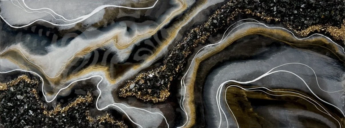 Resin, 2025, Sold A large 2’x4’ resin piece poured on wood panel. Resin coloured with mica powder and alcohol inks, framed by gravel, fire glass and crystals.