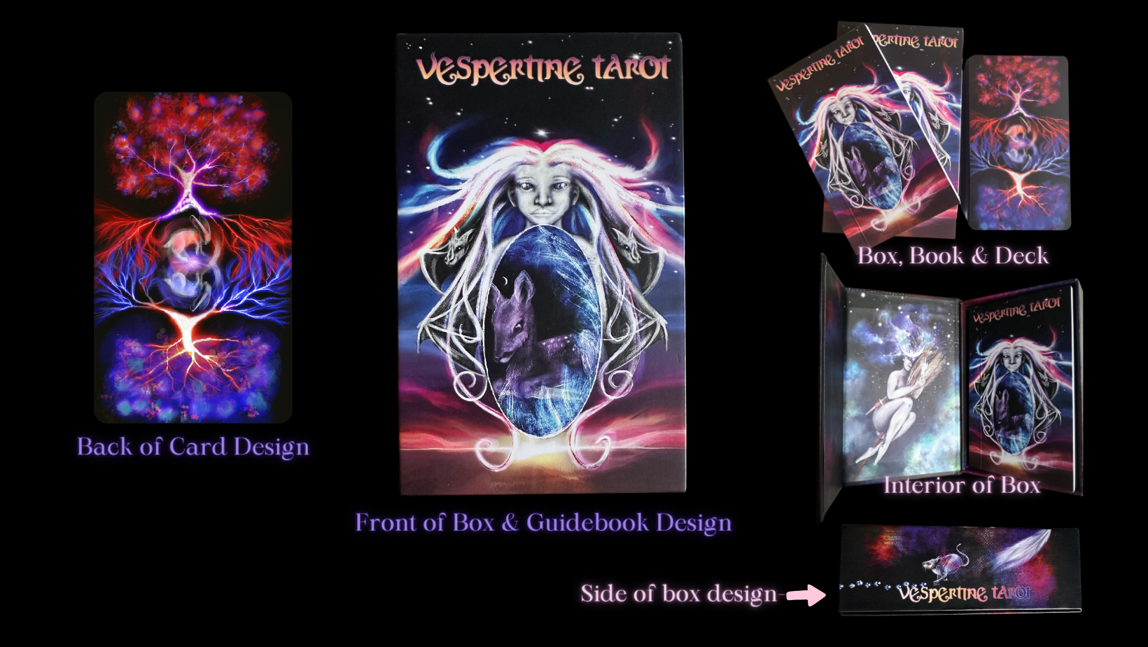 Vespertine Tarot brings classic meanings of the cards and weaves them into new artistic themes to convey the deep meaning amidst the backdrop of lunar energies, Pagan Gods and Goddesses and vespertine animals.